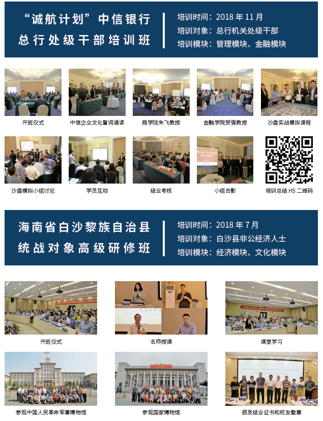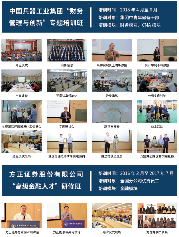 近年来,437bwin必赢国际官网举办了各类高级培训班,先后组织承担了中信银行、中国兵器工业集团、海南省白沙黎族自治县统战部和工商联、方正证券股份有限公司、中国邮政储蓄银行天津分行、北京市延庆区、桂林市财政系统、泸州市财政系统等企业和政府的高端财经培训,专门针对政府、企业的人才培养需求量身定制课程,在服务经济建设、社会发展和人才培养方面取得了卓越成效。
