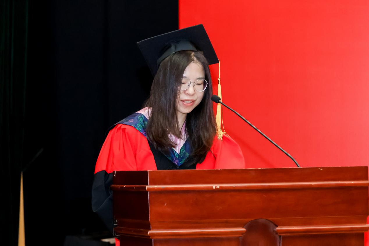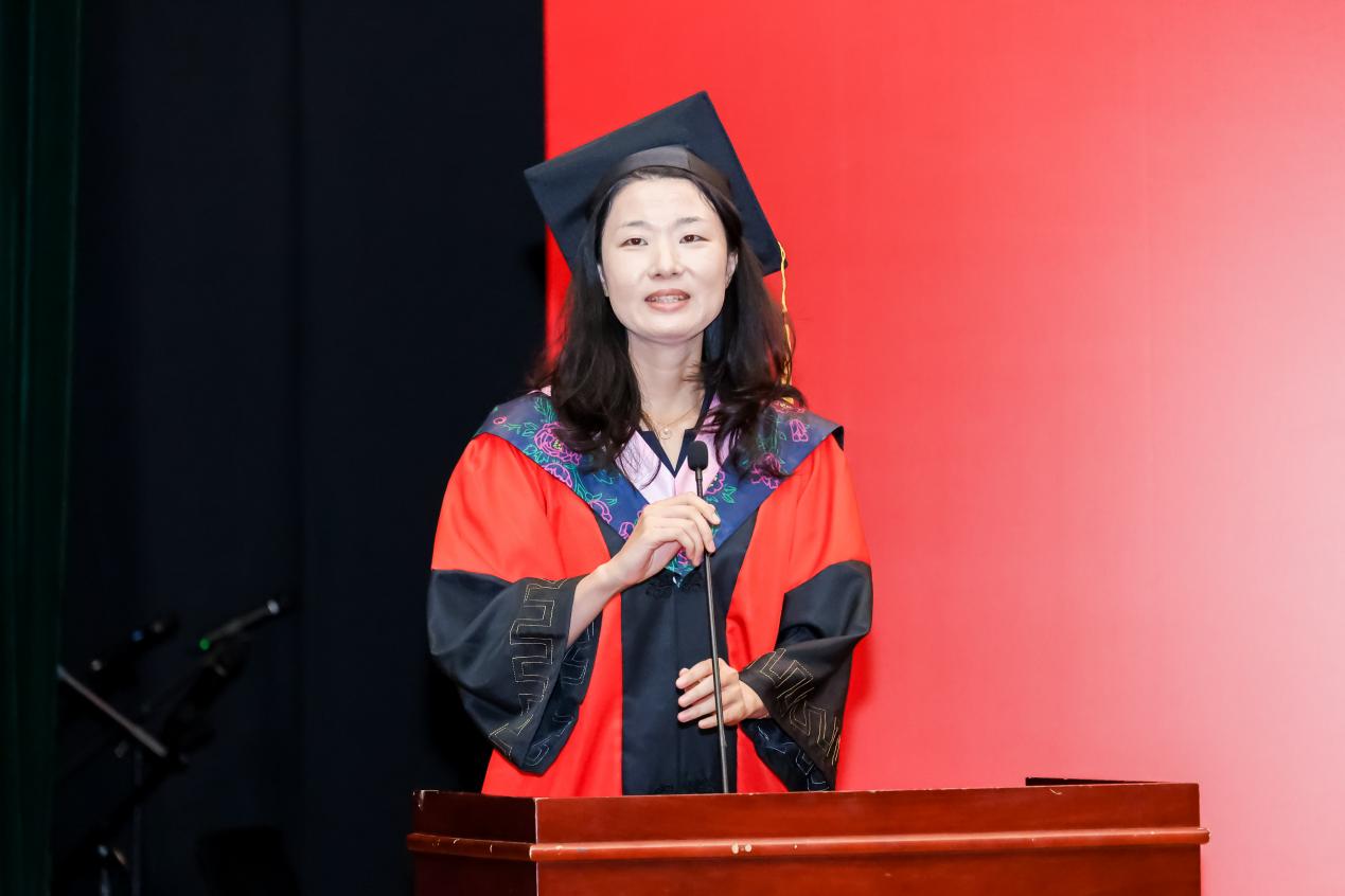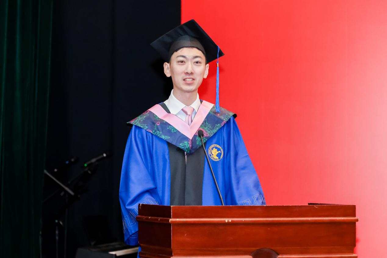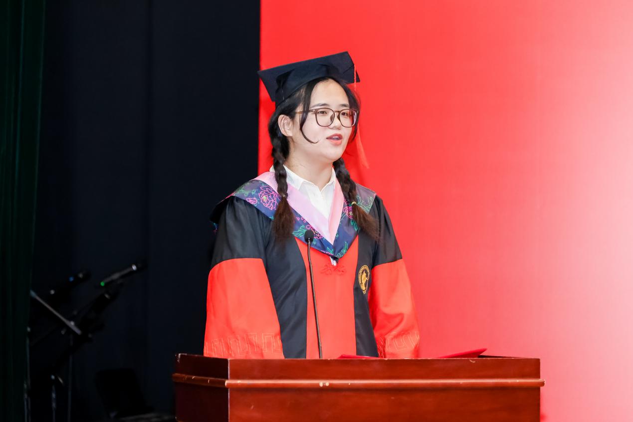 博士毕业生姜福斌作为学生代表发言。她首先恭喜博士生同学们如愿应答“你什么时候毕业”的灵魂拷问。她表示这一路收获的不仅是知识,更是勇于质疑、不断创新、不折不挠的科研精神。借用导师的一句话“严谨的态度让人无懈可击,科学的方法让人无往不克”,她倡导大家未来无论投身何项事业,都要以校训为指引,用脚踏实地的行动和开拓创新的思维,为社会创造更大价值。最后,她祝愿大家前程似锦,鹏程万里,不忘初心,砥砺前行。