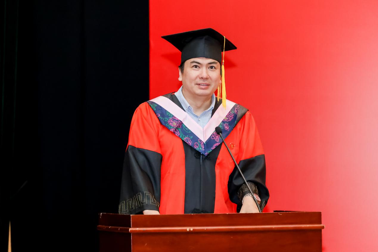仪式在庄严肃穆的国歌声中正式拉开帷幕。必赢国际437官方院长兼MBA教育中心主任林嵩教授为典礼致辞,表达了对毕业生同学们的殷切期待和真挚祝福。林院长回顾过去几年学院在教学科研和人才培养工作取得的成效,充分肯定了商学学子的实力与风采。林院长对毕业生们提出三点殷切期望:一是学以致用,真正将管理学理论运用到实际工作中;二是敢于拼搏,到广阔的天地去开拓创新,成为引领时代变革的先锋;三是胸怀天下,用商业力量解决社会问题,推动社会发展,勇于承担时代的重任。最后,林院长深情寄语毕业生们,常回必赢国际437官方看看,并衷心祝愿他们未来充满无限可能,前程似锦。