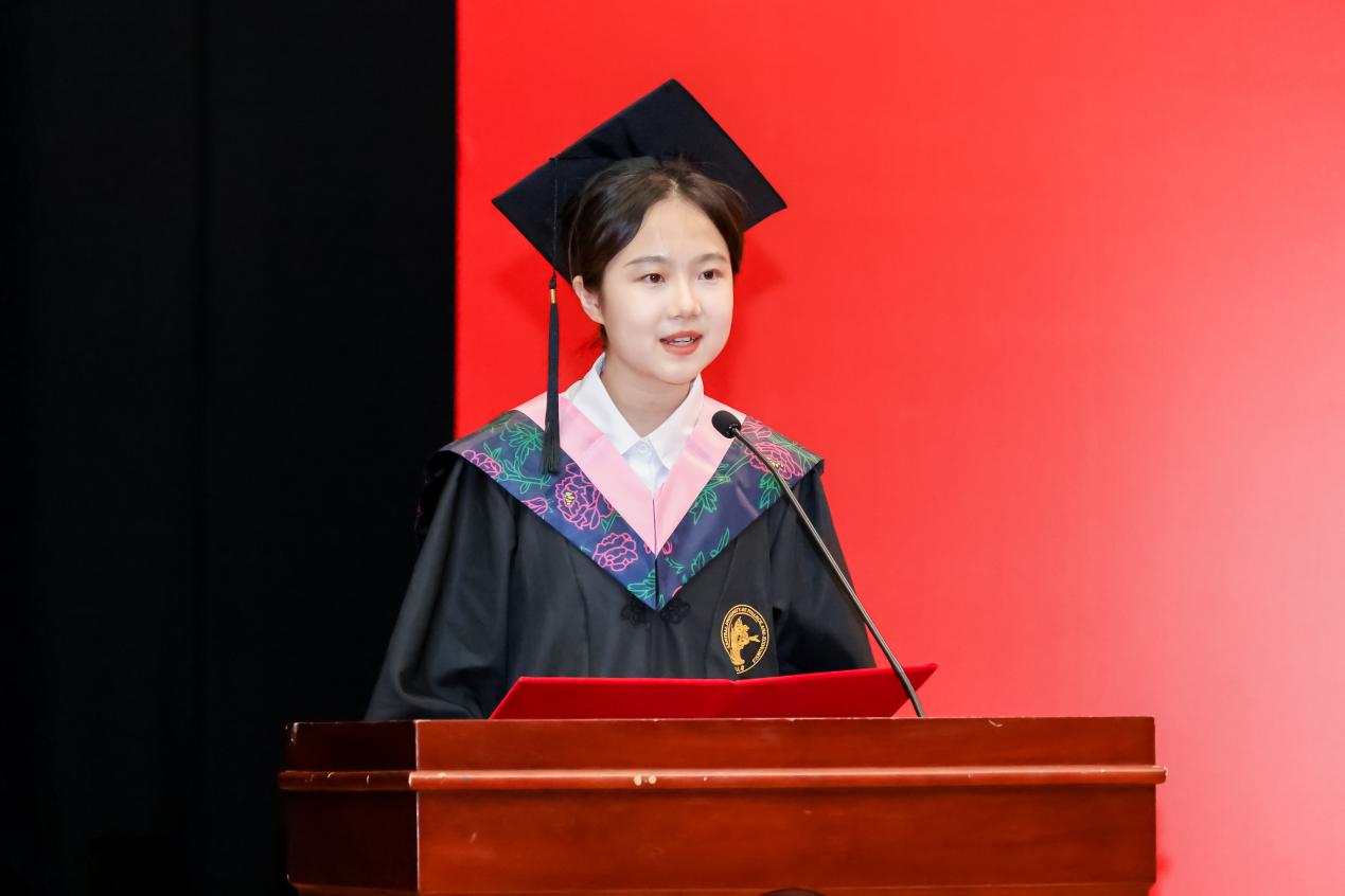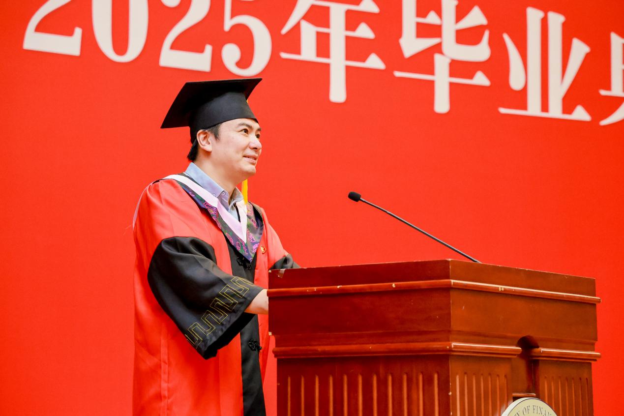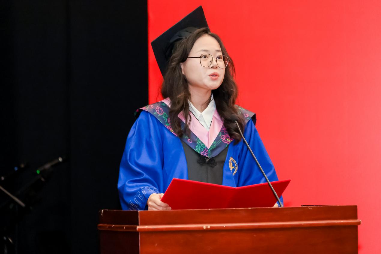 学术型硕士毕业生杨进京作为学生代表发言。她感慨道,这一路走来,每一步都磨砺了意志,提升了能力,正是无数次的尝试与失败铸就了今天的自己。在未来的日子里,她将以437bwin必赢国际官网“忠诚、团结、求实、创新”的校训为座右铭,并祝福各位追梦的中财人山水有相逢,来日皆可期。