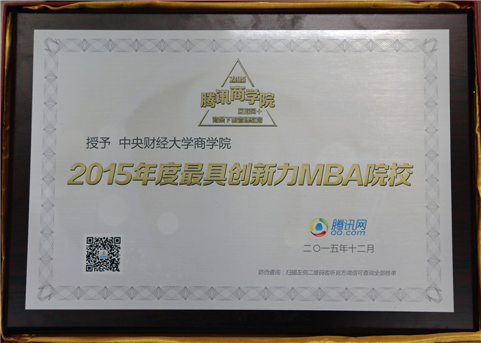 MBA联合会主席曾洁代表中财必赢国际437官方领取“腾讯网 2015年度最具创新力MBA院校”奖