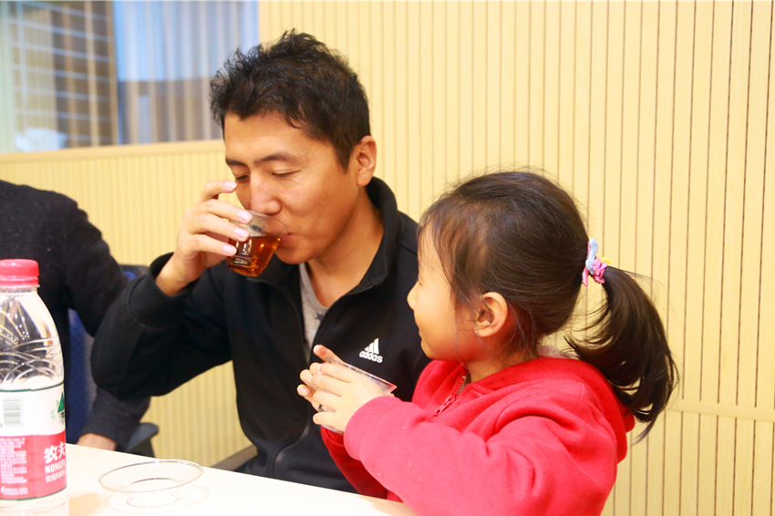 讲座伊始,国艺学院的茶艺师献上了一场优雅精彩的藏茶茶艺展示。在美妙空灵的音乐中,茶艺师在茶台前缓缓坐下,伴随着悠扬的讲解,逐一燃香、洁器、煮茶、分杯。藏茶香气四溢,氤氲悠长,传与大家共同品尝。