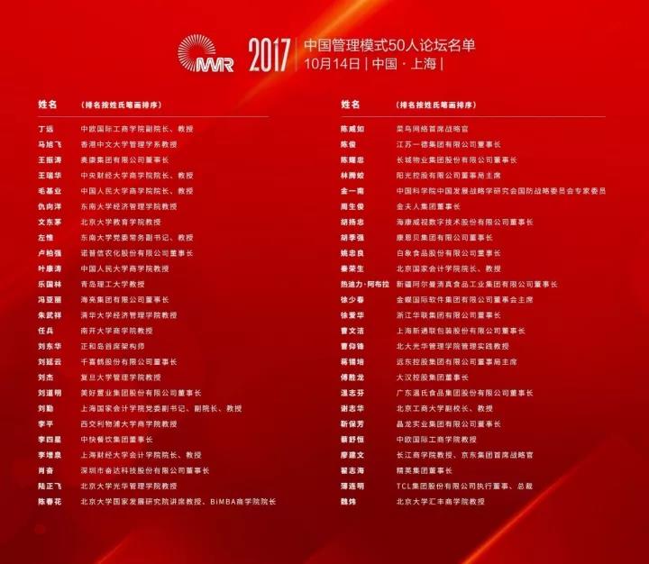 2017年10月14日,由北大国发院教授陈春花等25位管理学者、金蝶集团创始人徐少春等25位企业家共同发起的“中国管理模式50人论坛”在上海举行,论坛由中国管理模式杰出奖升级而来,探讨在文化自信背景之下独特的中国管理价值。必赢官网必赢国际437官方院长兼MBA教育中心主任王瑞华教授以25位管理学者之一的身份,入选“中国管理模式50人论坛” (简称C50论坛),并参加了论坛的讨论和交流。