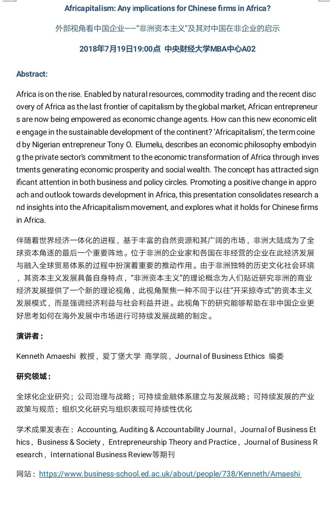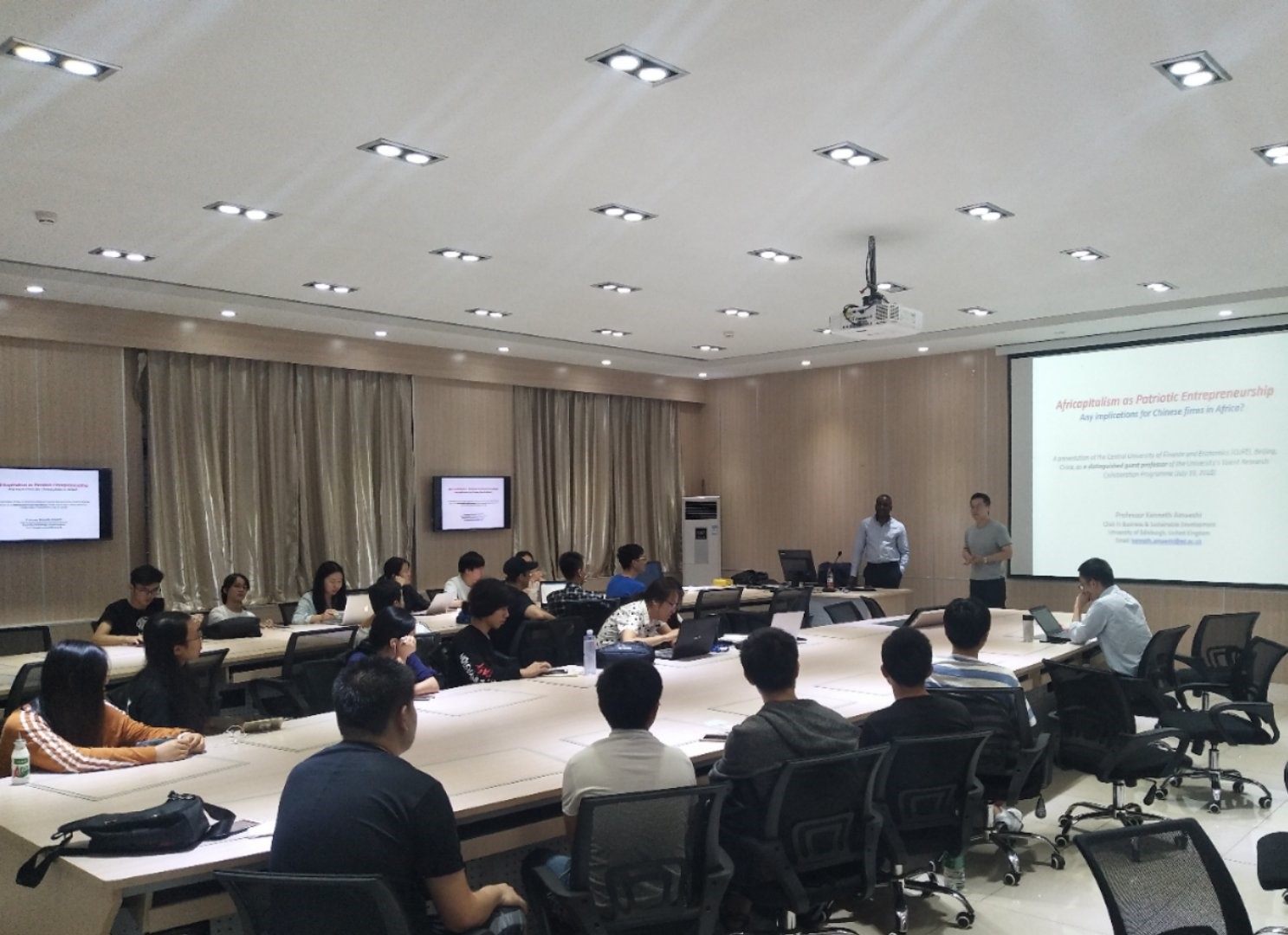 Kenneth Amaeshi教授在必赢国际437官方MBA中心进行了一场题为“Africapitalism as Patriotic ntrepreneurship: Any Implications for Chinese Firms in Africa”的学术演讲。演讲中Kenneth Amaeshi教授从政治经济学视角对非洲国家的市场经济和制度环境进行了剖析,并提出当地爱国主义企业家应该扮演的积极作用,最后,Amaeshi教授从非洲视角对在非的中国企业提出管理与发展建议。