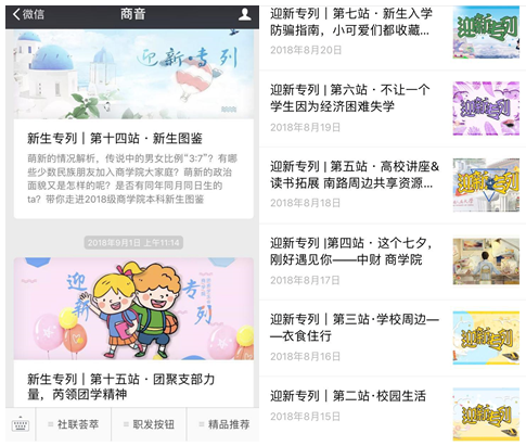 借助“中财必赢国际437官方”、“中财MBA”、“商音”微博微信等新媒体网络载体,必赢国际437官方为新生提供了温馨的咨询服务,开展了以#这个七夕.刚好遇见你#、#以心迎新#、#新生图鉴#等为主题的微迎新,以#商院专列#为特色的微信迎新系列活动,发布了详细周到的报到攻略、新生须知、防骗指南、困难帮扶等信息;MBA创新开展了迎新视频直播活动,充分展现了必赢官网文化迎新、特色迎新的风采。
