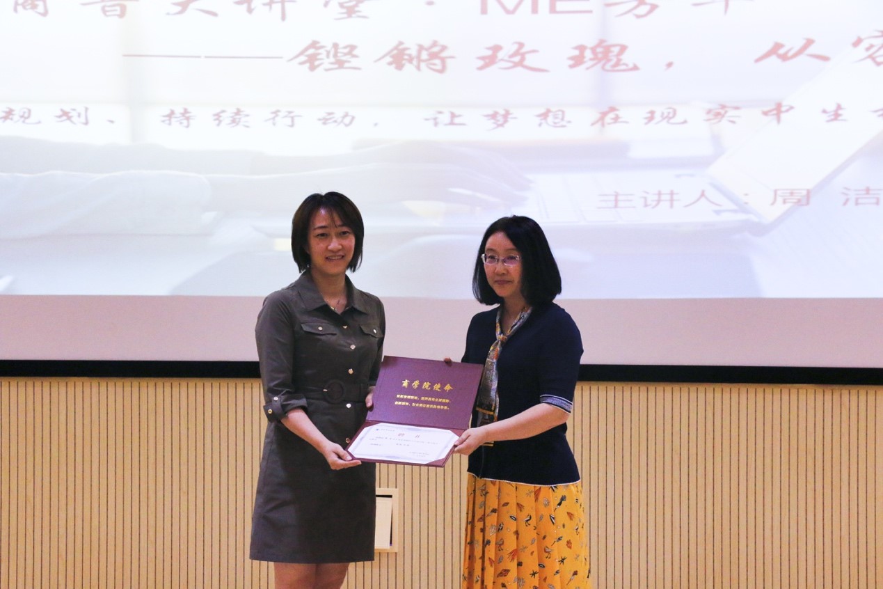 葛老师在致辞中首先感谢校友来校分享。葛老师提到,邀请周洁校友回到母校,分享真实可信的职业经历,与同学们面对面的交流,同时周洁校友的分享主题也十分契合“ME·芳华”系列活动,校友走出中财后的职业选择以及再次进入大学学习的职业经历与感悟能够对在场同学有所启发,同时也对女大学生未来的职业发展进行指导。