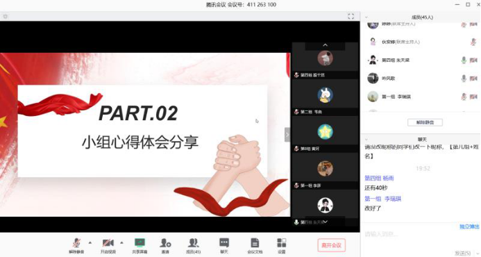 支部于2月29日举办了“同心抗疫、共克时艰”线上主题分享会。支部党员以小组为单位,依次分享在疫情防控一线先锋们的感人事迹和近期学习的心得体会,提倡大家向优秀人物学习,进一步强化学生党员对于抗疫工作的理解和支持。党员们纷纷表示坚决做到不离家、不返校,充分发挥党员的先锋模范带头作用,在力所能及的范围内为抗疫工作贡献力量。