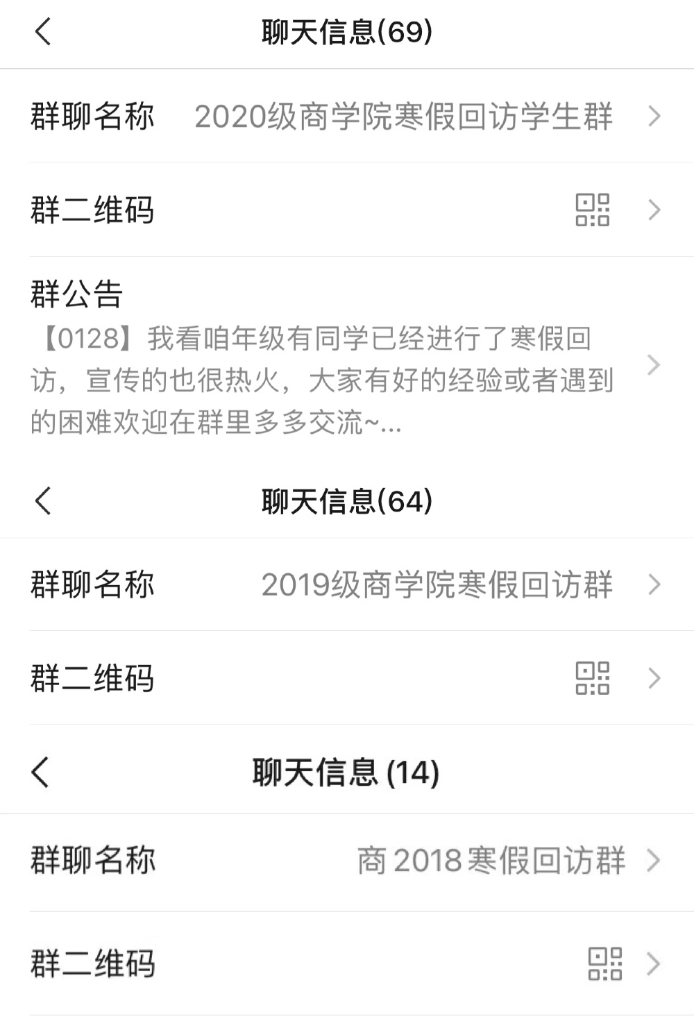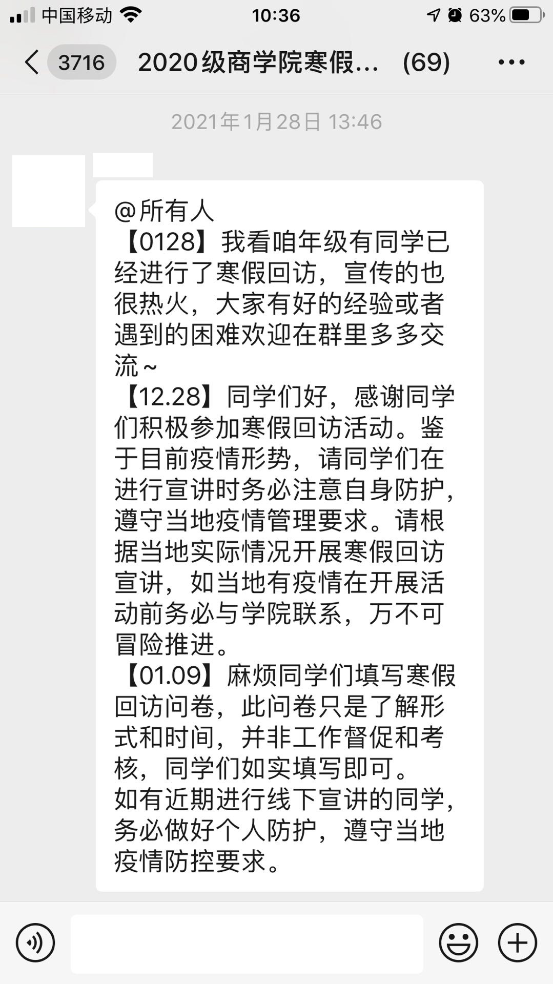学院分年级组建了寒假回访学生工作群,方便同学们在群内交流经验;通过问卷方式随时了解学生参与回访活动的进度和面临的困难;学院招生宣传工作小组老师和各年级辅导员在群内从内容、形式、安全等多方面指导学生开展回访活动。学院对参加陕西、甘肃两省中学回访的同学给予了高度关注,针对因疫情等原因无法入校回访的情况,学院除帮助学生与中学联系沟通外,还指导学生通过线上直播、视频录播、微信推送等形式开展线上回访;对于已经完成回访活动的学生,学院及时进行沟通交流,从学生反馈进一步了解中学的需求、期待和当地生源情况。这样的跟进指导工作既锻炼了招生宣传的学生队伍,丰富了宣传渠道与模式,为进一步开展本科招生宣传工作打下了良好的基础。