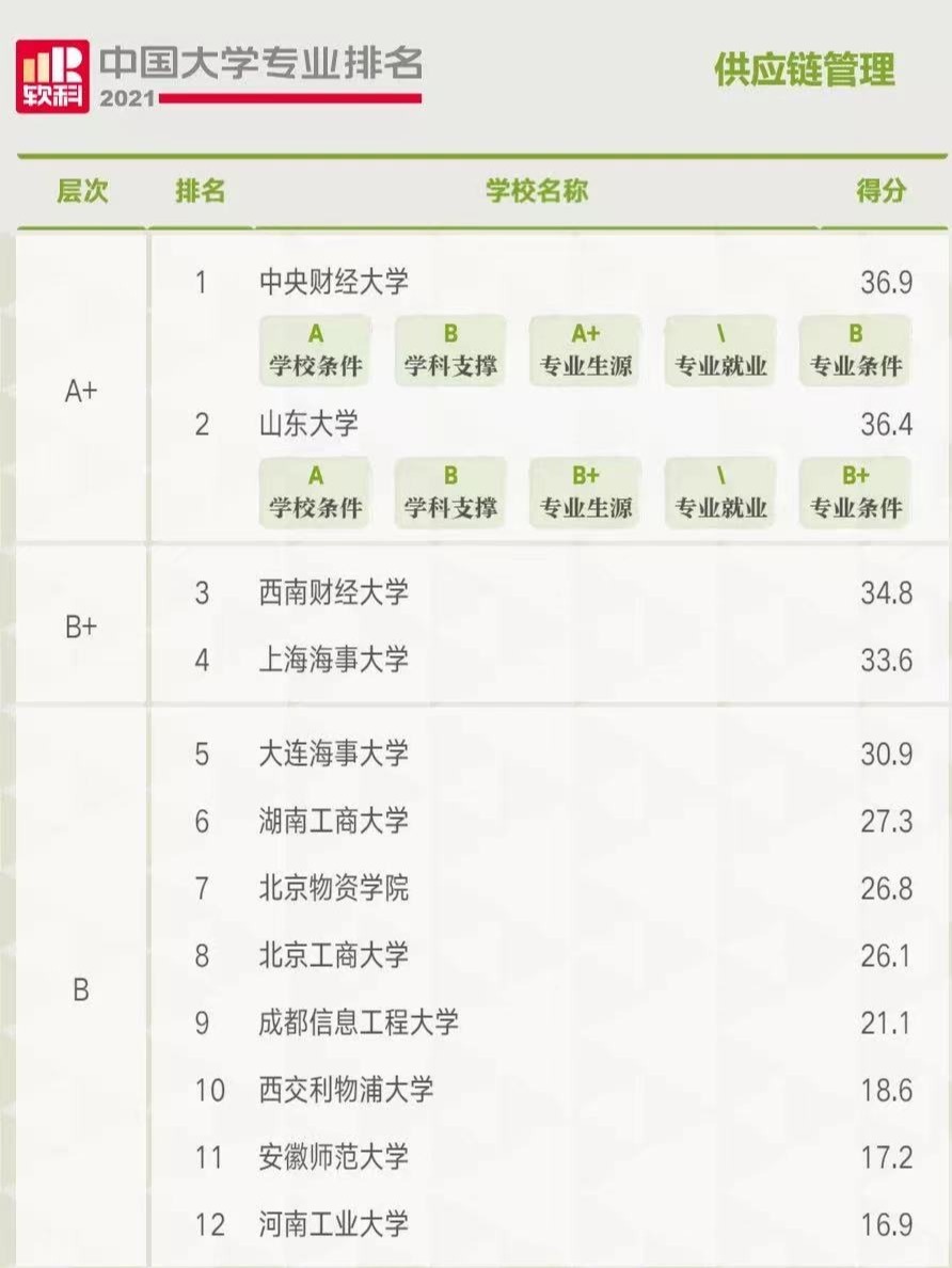 必赢官网供应链管理和市场营销专业均获得A+等级,且供应链管理位列第一。同时,人力资源管理和工商管理也均获A等级。