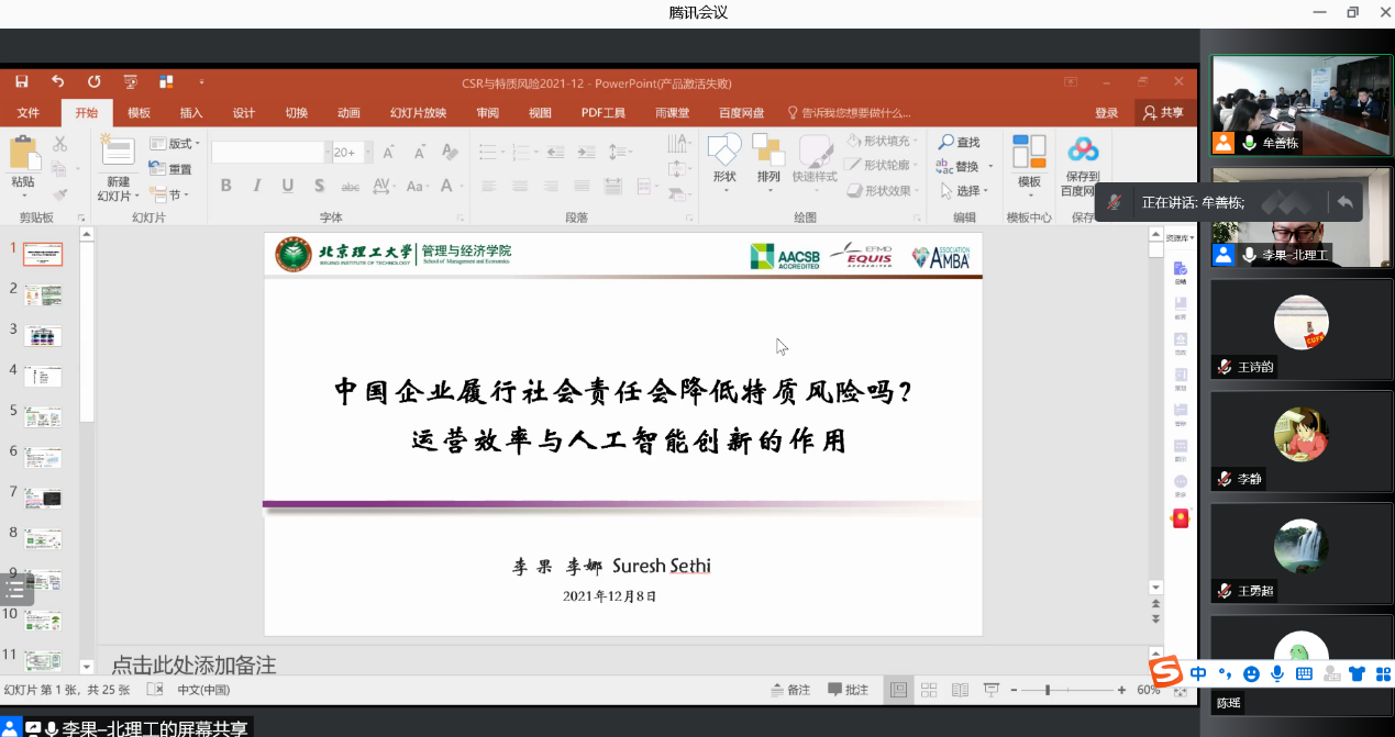 李果教授本次主讲的题目为“中国企业履行社会责任会降低特质风险吗?运营效率与人工智能创新的作用”,该研究发表于Production and Operations Management,该期刊是运筹管理领域的顶级刊物,UTD24期刊之一,在国际管理学界享有极高的学术声誉。研究揭示了中国情境下企业社会责任履行与企业风险特质的U型关系,并创新性的将人工智能创新纳入社会责任管理的考虑因素,指出人工智能创新与履行企业社会责任在降低特质风险方面有一定的替代作用,为企业更有效地应对商业伦理问题提供决策建议和管理支撑。