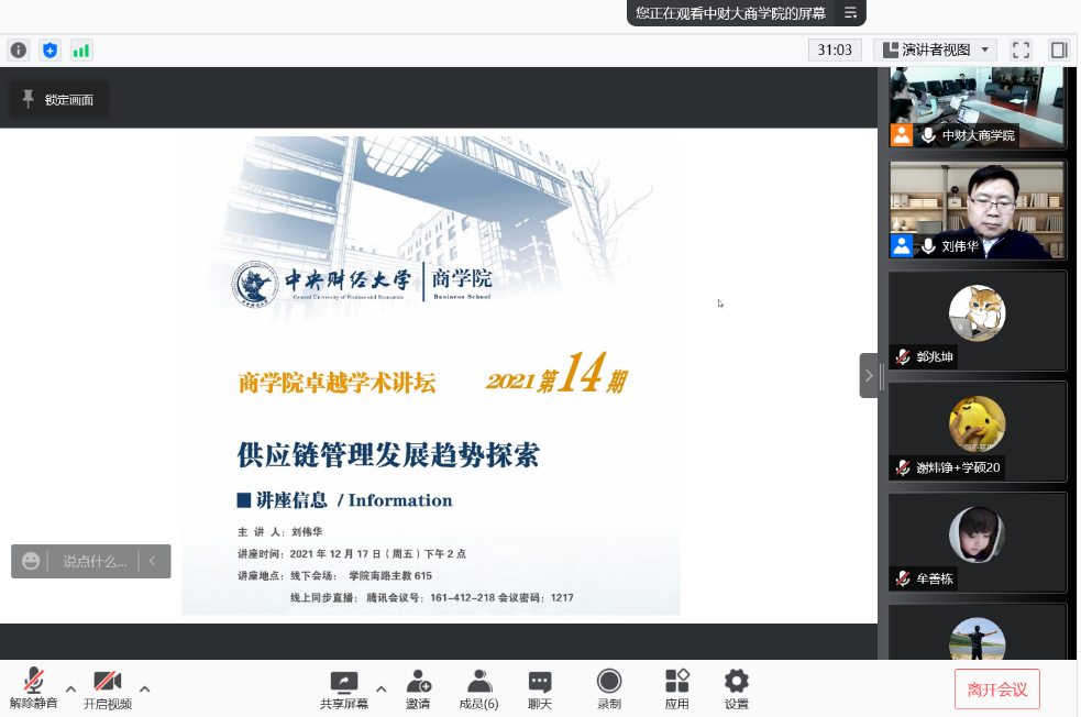 刘伟华教授本次讲座的主题为“供应链管理发展趋势探索”。主要围绕供应链管理的产生与发展历程展开,介绍了目前中国供应链创新的5大趋势,分析了近年来供应链管理领域学术研究的基本情况以及未来研究的6大发展趋势。