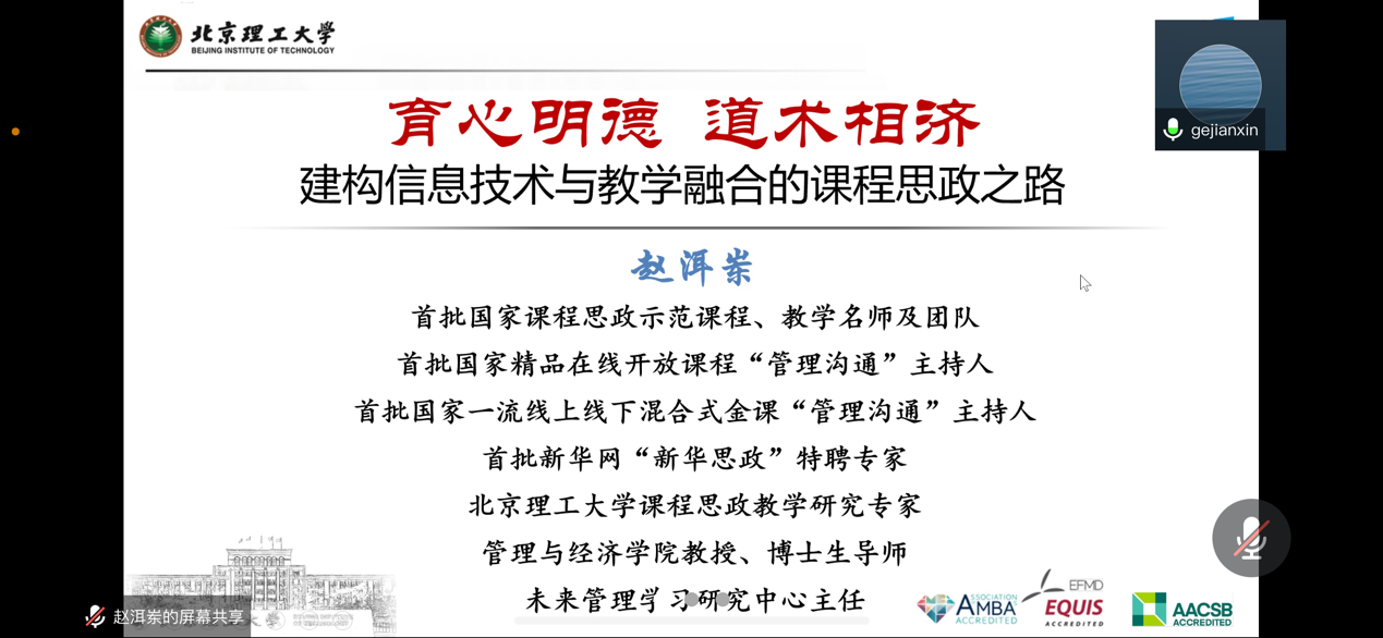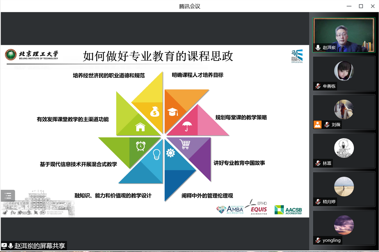 赵洱岽教授本次讲座的主题为“育心明德、道术相济,建构信息技术与教育教学相融合课程思政之路”,分享了为何需要在专业课教学改革中融入课程思政的时代动因,并结合自身教学成果,提出了融合课程思政的系统教学设计。赵洱岽教授根据“经管类”课程思政典型案例实践,向各位老师提出了“从教到育”的立体化人才培养模式建议.