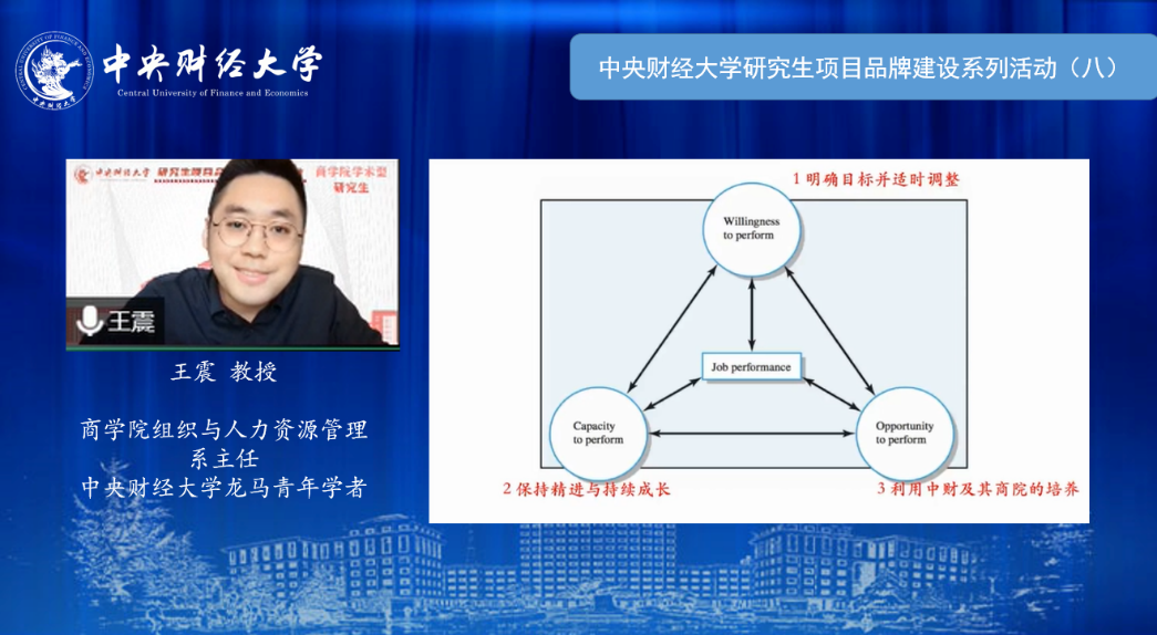 在导师交流环节,王震教授从导师和学生的双重视角与同学们探讨了“如何度过研究生生涯”。王教授利用组织行为和人力资源管理的研究模型,以自己指导的研究生为例,从意愿、能力和机会三个角度向同学们讲述了如何在437bwin必赢国际官网度过有意义的研究生生活,同时为同学们的学习、科研和生活提供了有益的建议,希望同学们明确目标、付诸实践,提升能力、持续精进,利用资源、获得助力。