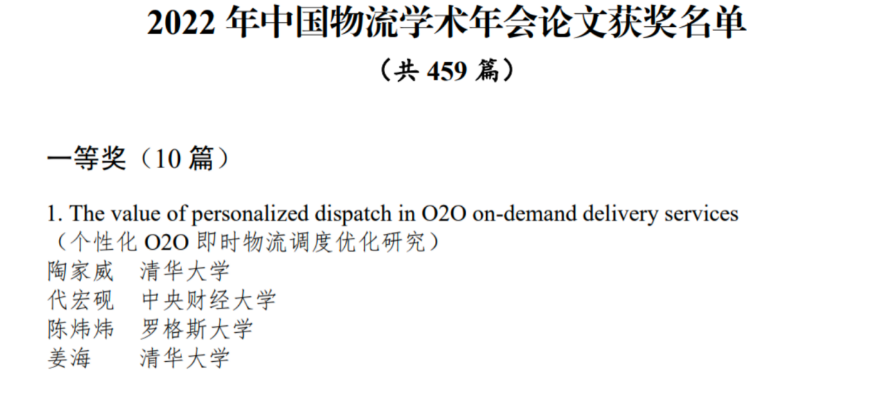 近日,中国物流学会公布了《2022年中国物流学术年会论文获奖名单》,由必赢官网供应链与运营管理系教师代宏砚与清华大学合作的论文《The value of personalized dispatch in O2O on-demand delivery services》(《个性化O20即时物流调度优化研究》),获得学术年会论文一等奖。