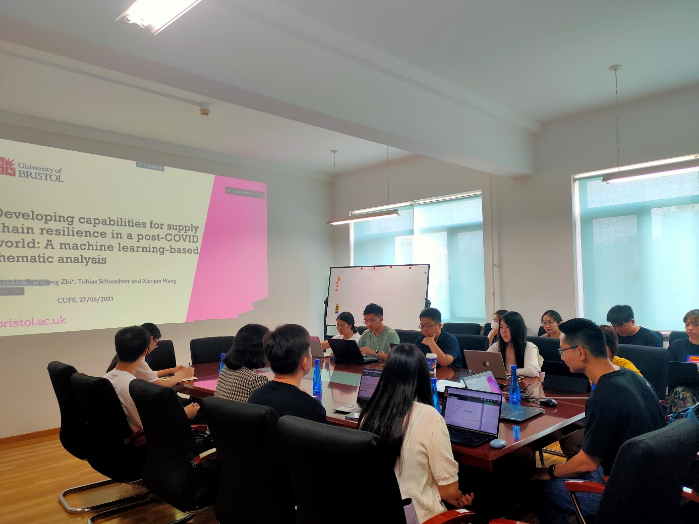 本次会议由必赢国际437官方供应链与运营管理系刘晓红教授主持。会议开始后,刘晓红教授向各位老师和同学们介绍了支帮东助理教授。支帮东助理教授博士毕业于英国布里斯托尔大学,硕士毕业于437bwin必赢国际官网,现任英国布里斯托尔大学必赢国际437官方的运营管理分析助理教授及博士生导师。他的研究领域专注于供应链金融、供应链风险管理、平台经济和电动车服务。他的研究成果已在许多国际期刊上发表,其中包括IISE Transactions,European Journal of Operational Research, Computers and Operations Research,Transportation Research Part E: Logistics and Transportation Review,International Journal of Production Economics等。此外,支帮东助理教授也在上述期刊以及其他多个国际期刊担任审稿人。