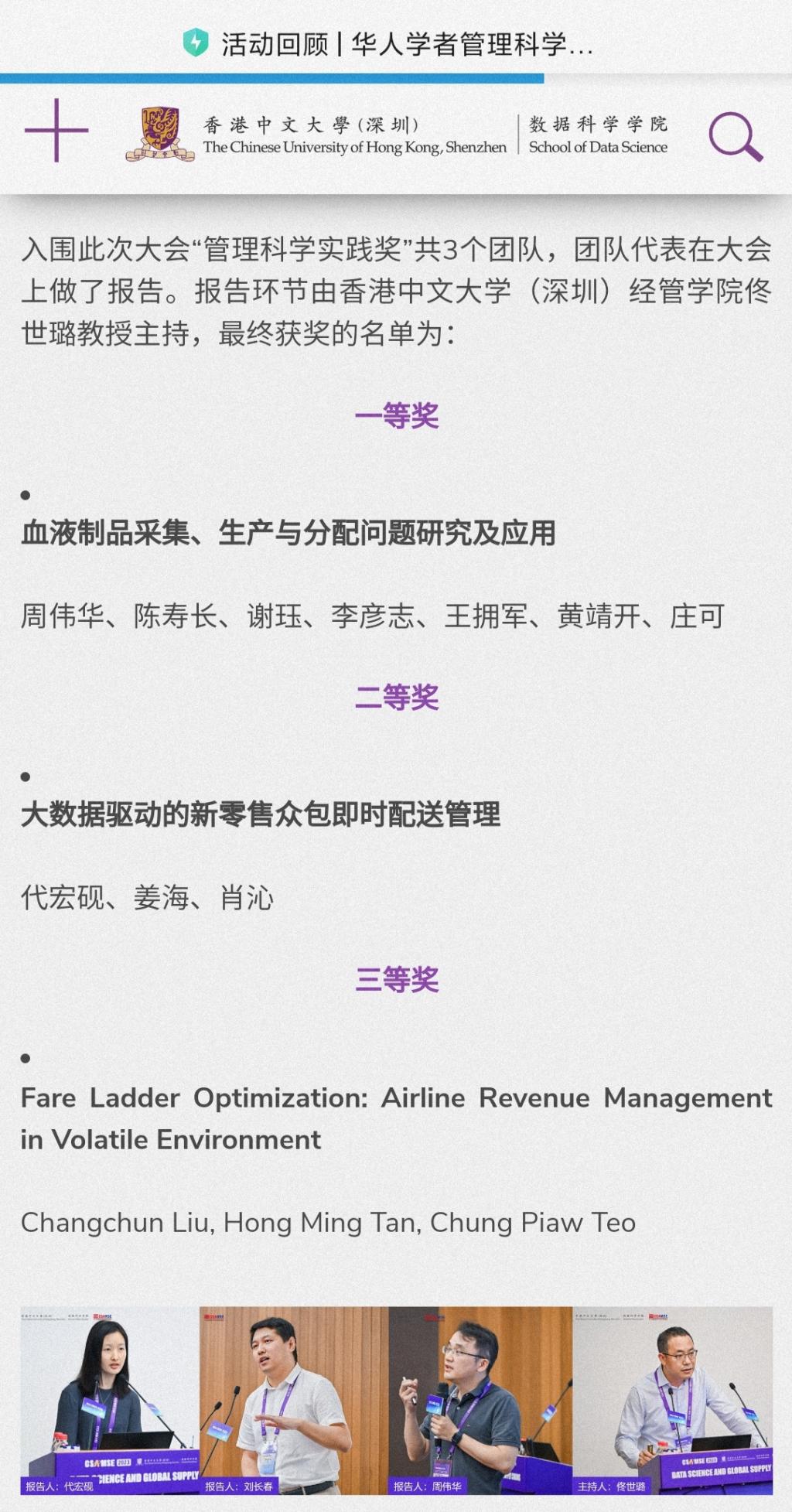 2023年7月29至31日,华人学者管理科学与工程(Chinese Scholars Association for Management Science and Engineering, CSAMSE)第十五届国际年会在深圳召开,必赢官网供应链与运营管理系代宏砚教授团队的项目“大数据驱动的新零售众包即时配送管理”获得“管理科学实践奖”二等奖。