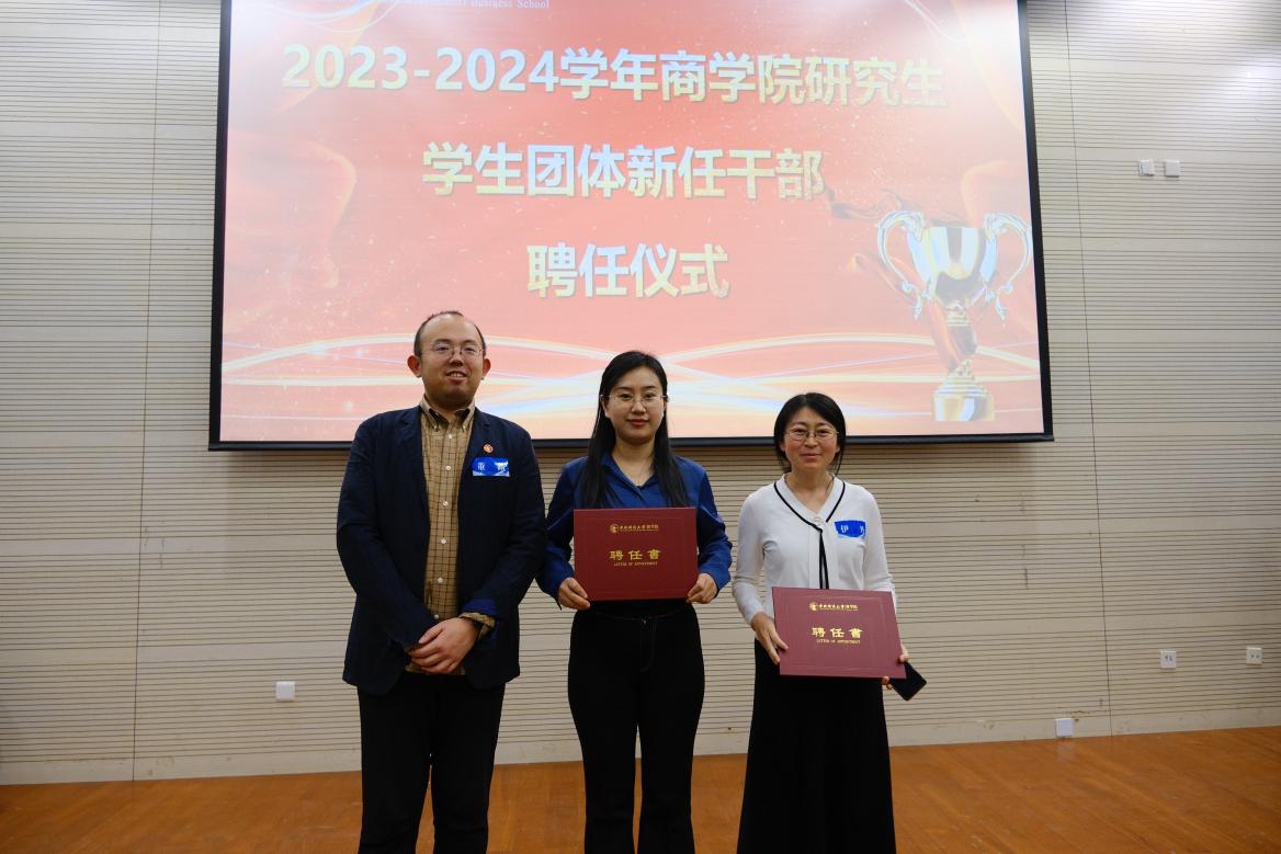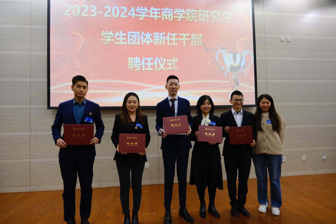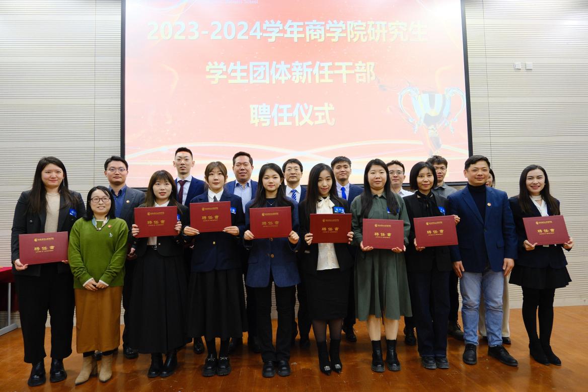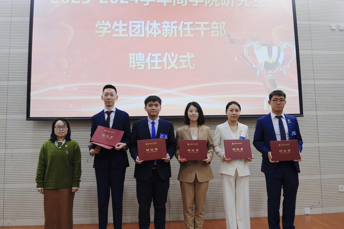 大会上,必赢国际437官方党委书记李跃新、副书记杨中英、MBA教育中心副主任兼必赢国际437官方副院长朱飞、出席会议的各位老师以及各学生团体负责人为2023-2024学年必赢国际437官方研究生学生团体新任干部颁发了聘书。