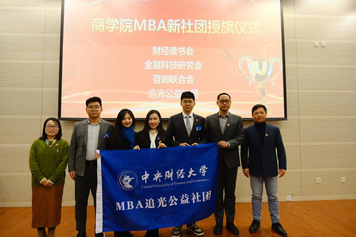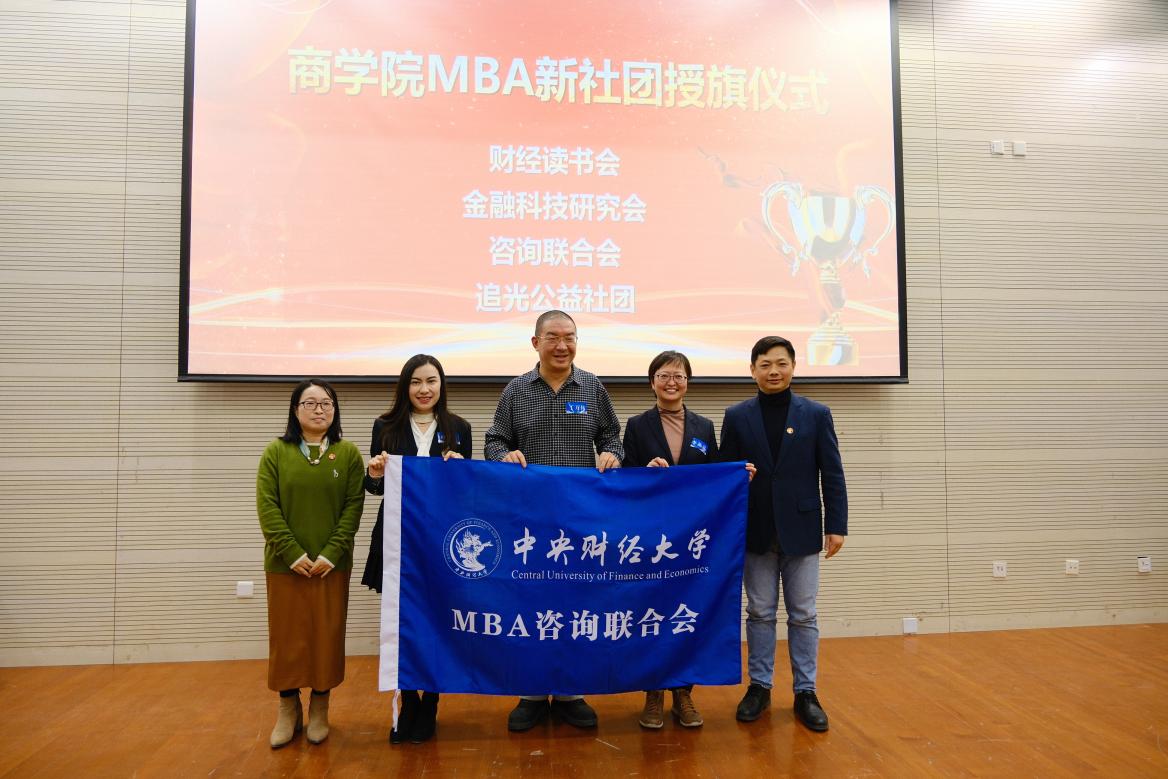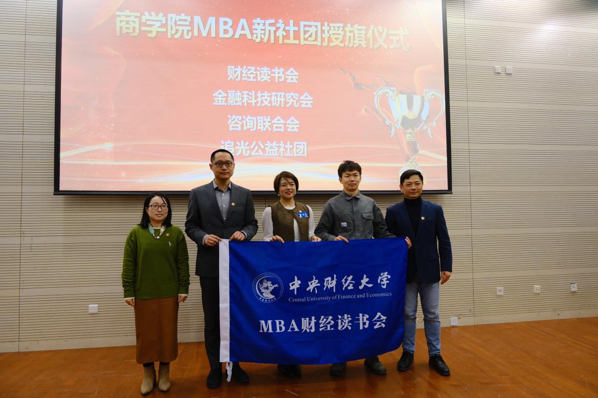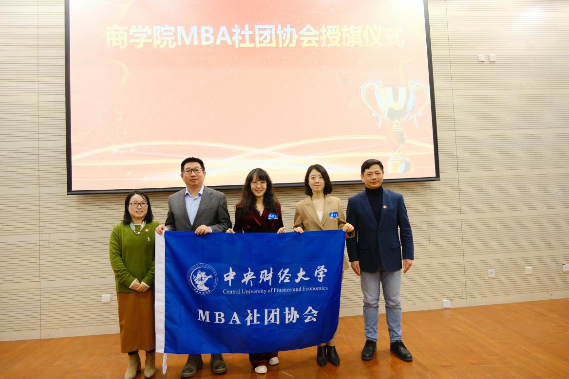 必赢国际437官方党委副书记杨中英、MBA教育中心副主任兼必赢国际437官方副院长朱飞向MBA社团协会主要发起人邱滢霏、李航、郭子瑶授旗。