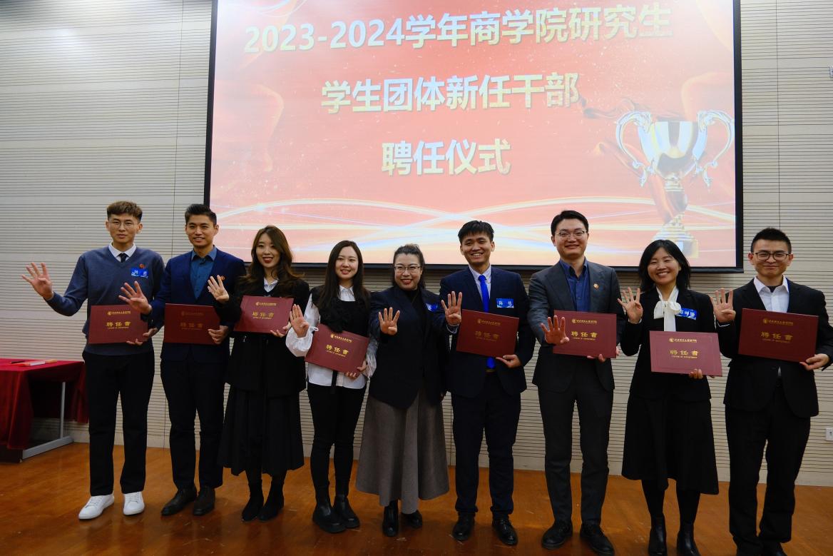 MBA学生工作部刘欣锋老师为房地产俱乐部执行主席22级吴红蕾、秘书长22级王尊、执行秘书长23级孟庆玮、副秘书长23级任茗聪、郑涵之、杨淞严、金麒;执行部长23级胡霖、李超、邵丽娜、张会延、张凯、周玉倩颁发聘书。