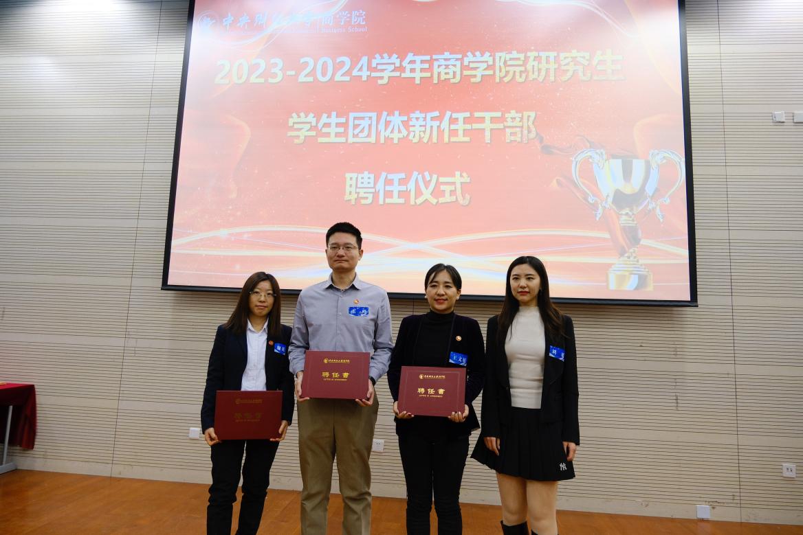 必赢国际437官方党委副书记杨中英、MBA教育中心副主任兼必赢国际437官方副院长朱飞为第二十届MBA联合会主席刘明华、秘书长孔一婕颁发聘书。