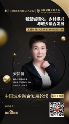 In the "China urban-rural integration development" forumco-hosted by China Capital Market 50 People Forum, China Urbanization Promotion Association and Baidu, Professor An Hexin, as the speaker of the 24th lecture of the public welfare online live broadcast lecture series, delivered a speech on "New Urbanization, Rural Revitalization and Integrated Urban-rural Development", on May 28. More than 190,000 subscribers participated in the online lecture.