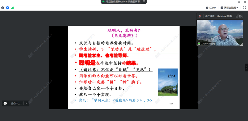 The title of Professor Zhou Nan's lecture was "Graduate Student Development: Are Smart People the Ones Who Do the Hard Work?" Professor Zhou argues that the growth of graduate students is a challenge for both the students and their supervisors. For research, one needs to have a clear mind in order to write clearly. The Yin-yang diagram can be used to illustrate how to write a paper, which consists of four specific phases. As a student, one should strive to achieve two "good at": Being good at showcasing progress and timely reporting confusions; being good at communication, understanding the supervisor's style, scheduling regular meetings with the supervisor, and addressing any difficulties promptly. As a supervisor, one should also strive to achieve two "good at": Being good at managing time and being considerate; avoiding a "high and mighty" attitude and instead being supportive and understanding towards students. At critical moments, supervisors shall provide guidance and support to help students maintain confidence and motivation, thereby graduating as soon as possible. Therefore, being smart is the result of persevering through the mundane, and putting in "hard work" is the "hard truth."