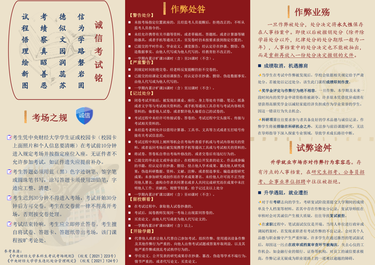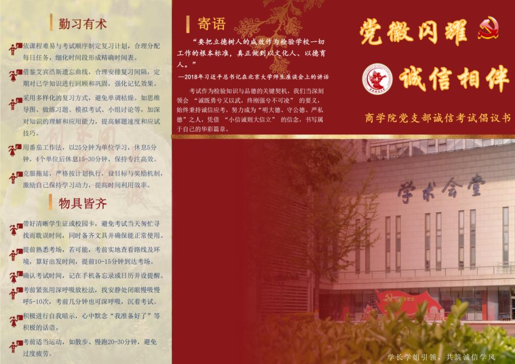 为让大一新生深刻理解学术诚信的重要性,本科生第一党支部精心制作了《必赢国际437官方党支部诚信考试倡议书》折页。这份折页不仅详细阐述了诚信考试的意义,还介绍了学术不端行为的严重后果,着重强调了考试期间应遵守的基本规范。此外,折页中还包含了相关的学习资源、图书馆服务以及考试前的准备工作提示,帮助新生们高效备考,提升自身的综合素质。
