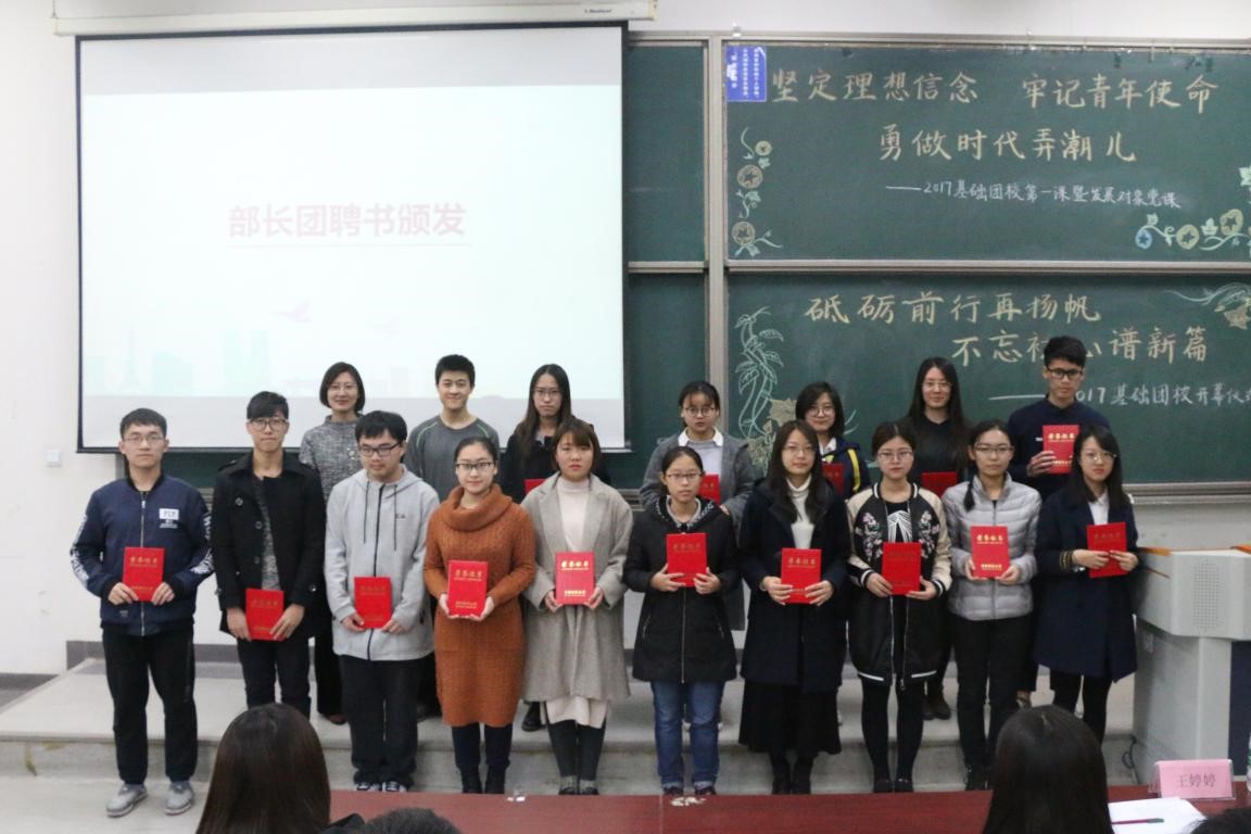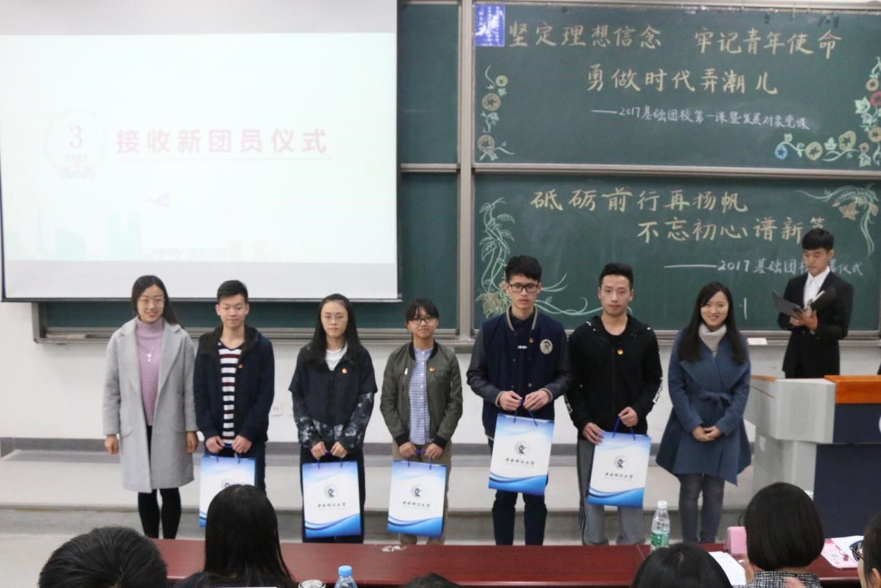 新生团员是此次基础团校培训的重点,2017年9月,必赢国际437官方团委接收了246名新生团员,成立了7个新生团支部。为了加强新生团支部建设,举办了接收新生团员仪式。由优秀团员代表为新生团员代表佩戴团徽,研究生会主席马雅璇与17-1班芮+导师潘昊宁向新生团支部发放“薪火相传”团务工作资料包。