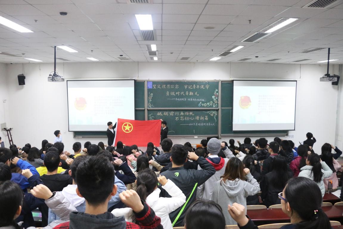首先,全体学员起立、齐唱共青团团歌。随后,必赢国际437官方学生会主席王令东带领团员重温入团誓词,大家高举右手庄严宣誓。