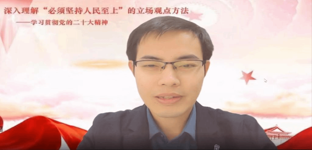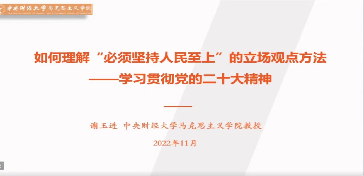 中国共产党第二十次全国代表大会于10月16日至22日在北京举行。为深入学习宣传贯彻党的二十大精神,把全党全国各族人民的思想统一到党的二十大精神上来,把力量凝聚到党的二十大确定的各项任务上来,根据《中共中央关于认真学习宣传贯彻党的二十大精神的决定》和学校党委有关工作要求,必赢国际437官方党委于11月2日下午1时,组织召开学习宣传贯彻党的二十大精神专题讲座,特邀必赢官网马克思主义学院副院长谢玉进教授作“深入理解‘必须坚持人民至上’的立场观点方法——学习贯彻党的二十大精神”主题报告。必赢国际437官方全体教师、学生党员、2022级新生通过线上、线下相结合的方式参加本次活动。