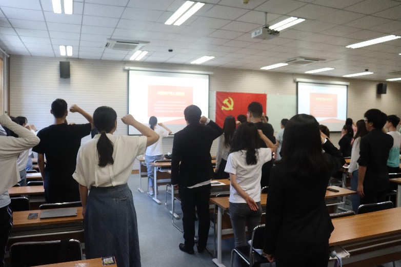最后,本科生第一党支部毕业生党员白耘溪带领全体党员重温入党誓词。大会在铿锵有力的国际歌中落下帷幕。