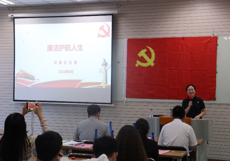 学校纪委办公室副主任、监察处副处长、监督检查室主任卢宁以“廉洁护航人生”为主题给全体毕业生党员开展纪律教育。卢老师为党员们解析了关键词定义,结合鲜活的案例给大家剖析了腐败低龄化的趋势,分析了当前反腐倡廉的形势。她提出,青年毕业生尤其要重视腐败问题,让廉洁护航人生:一要做到系好人生第一颗扣子、把好人生总开关;二要依规依纪用权,时刻心存敬畏,警醒自己谨慎行事;三要培养健康爱好,守住欲望之门,坚守纪法底线;四要时刻严以修身,保持廉洁定力,始终做到自重、自省、自警、自励。