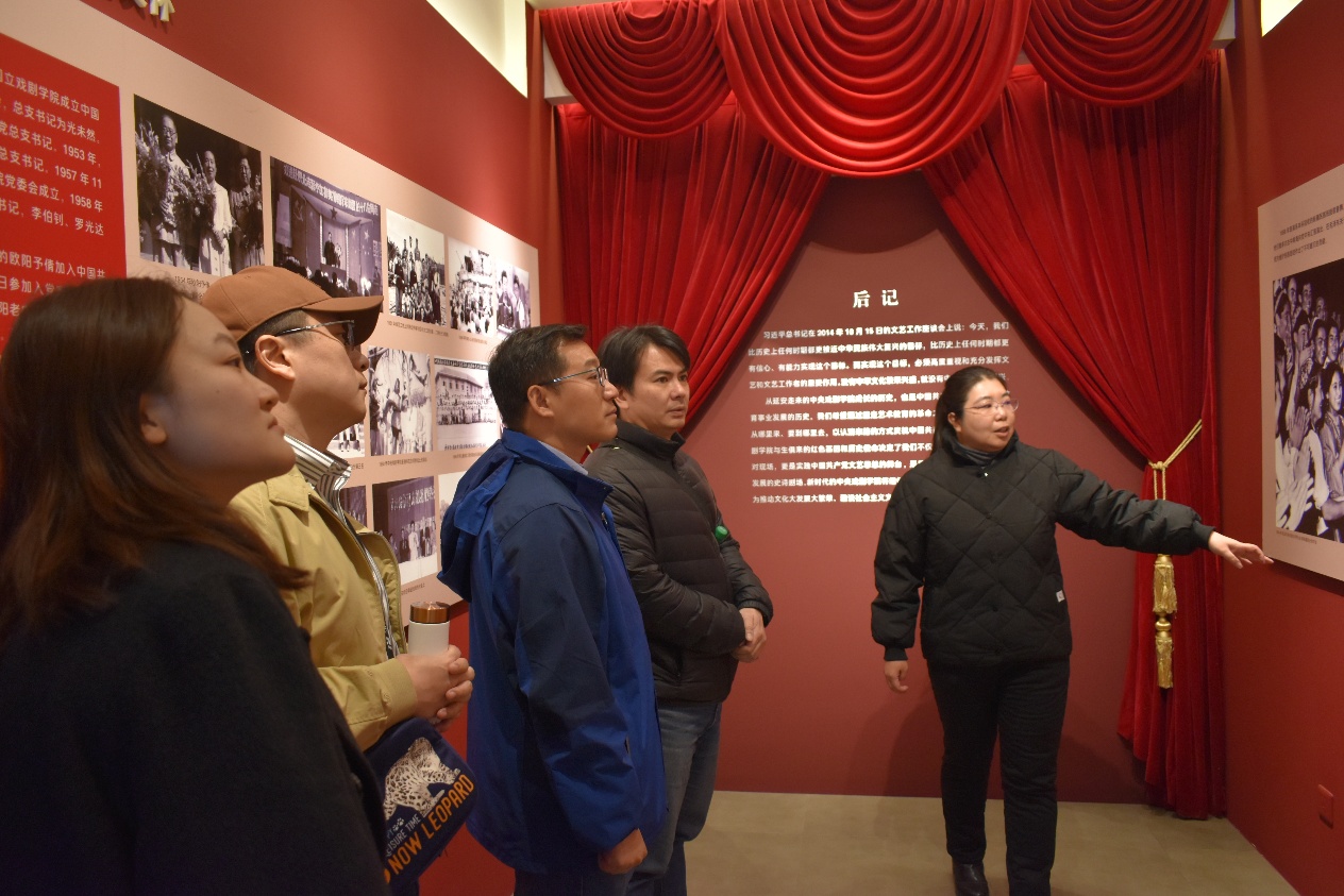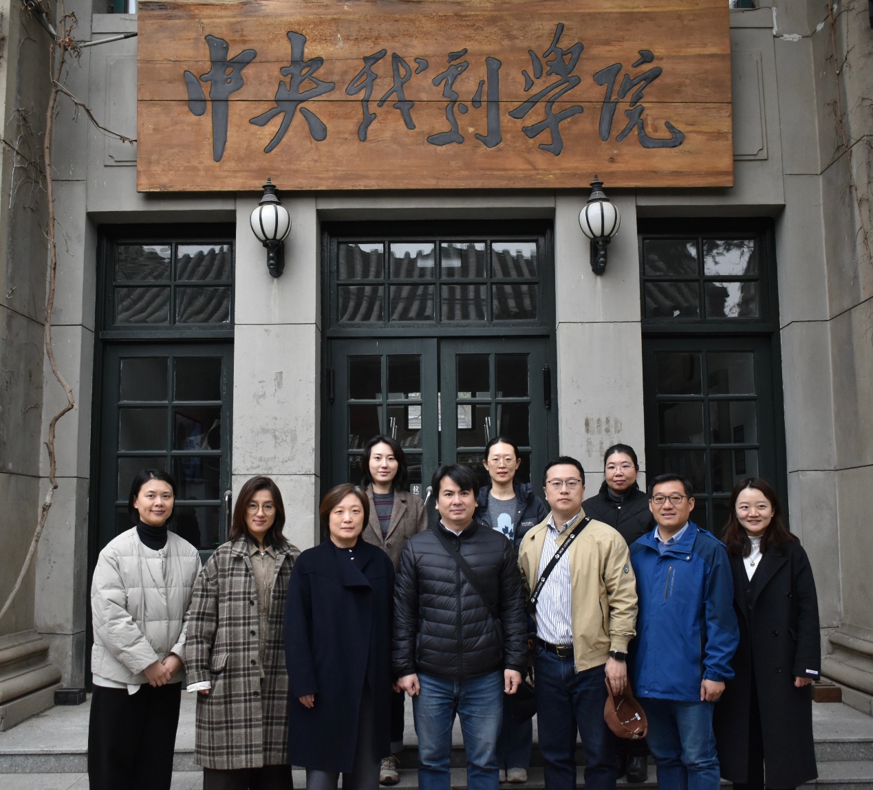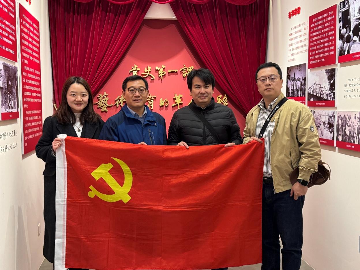 两校教师共同参观了中央戏剧学院东城校区内的“党史第一课”纪念馆。在纪念馆内,一幅幅珍贵的历史照片、一件件饱含故事的文物,生动地展现了中国共产党从诞生到发展壮大的光辉历程,全景再现了中国艺术教育的革命之路。参观过程中,教师们认真聆听讲解,不时交流心得,深刻感受到红色文化的深厚底蕴。参观结束后,全体教师在纪念馆前合影留念,记录下这难忘的时刻。