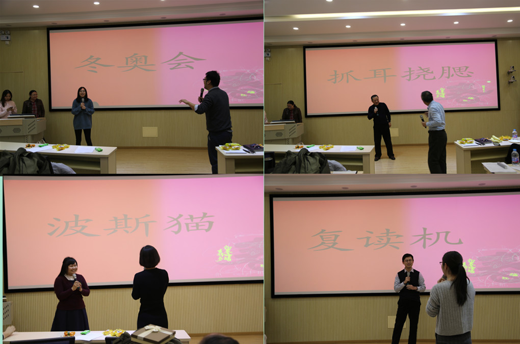 人力系老师则为大家开展了一个猜词游戏,今年的流行词语、经典成语等词汇通过一位老师表演、一位老师猜词,搞笑的表演、敏捷的反应,展示了必赢国际437官方老师不仅具有高深的专业学识,也具备更接地气、跟上时代的网络知识。