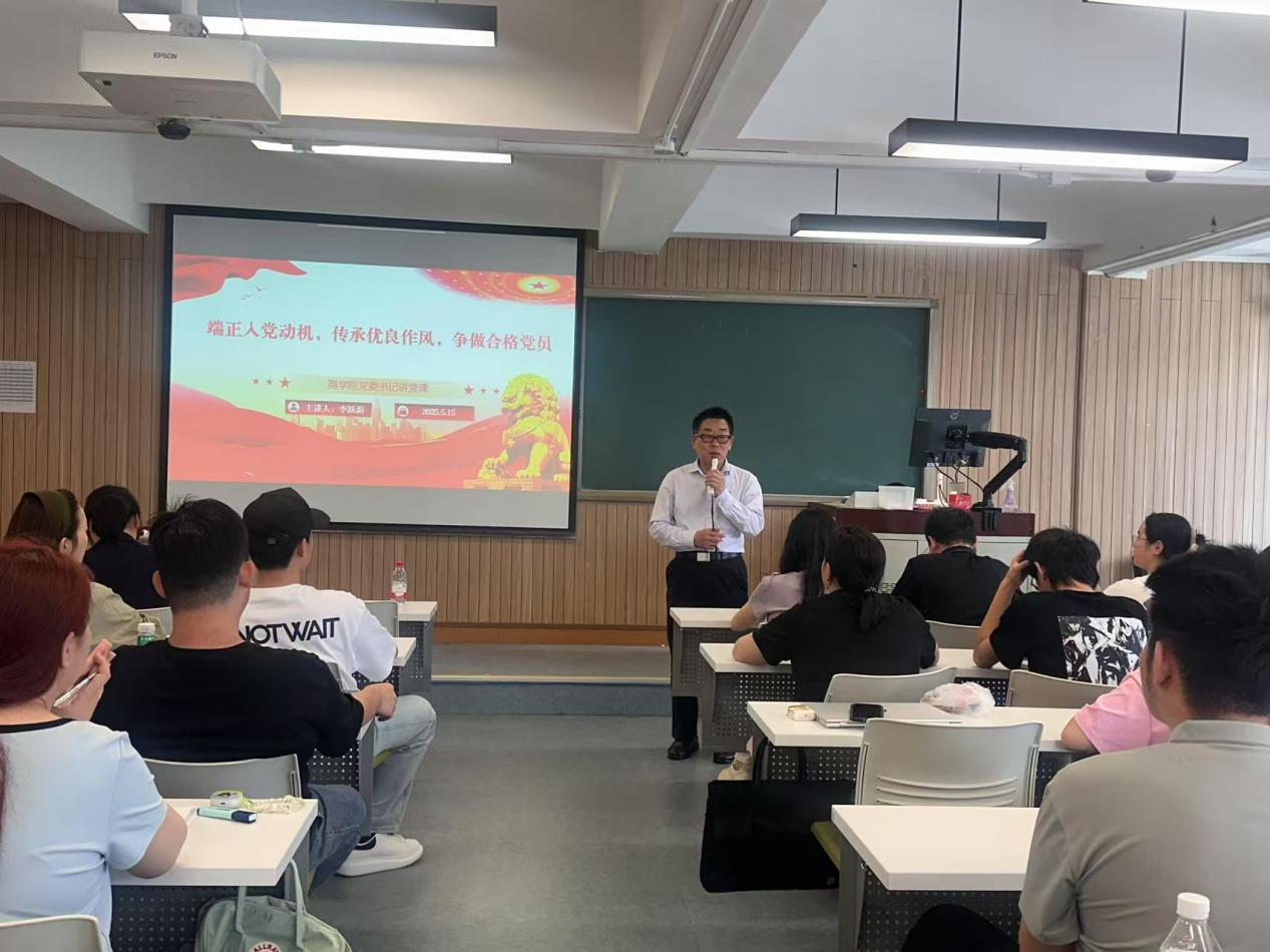 为深入贯彻中央八项规定精神学习教育,进一步加强入党积极分子的党性修养和思想教育,2025年5月15日中午,必赢国际437官方党委在学院南路校区主教303教室举办入党积极分子、发展对象专题党课《端正入党动机,传承优良作风,争做合格党员》。此次培训由学院党委书记李跃新主讲,党委组织员王志梅主持,党务秘书窦宗玥及入党积极分子、发展对象等115人参加。